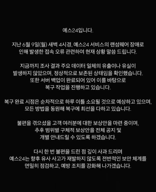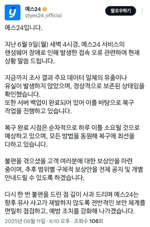 예스24는 “서비스 복구가 최우선 과제”라며 24시간 내 주요 기능 우선 복구를 목표로 삼았습니다. 현재 백업 서버에서 주문·결제·티켓 예매 모듈을 분리 복원 중이며, 고객들에게는 이메일·SNS를 통해 복구 진행 상황을 수시로 공지하고 있어요.
