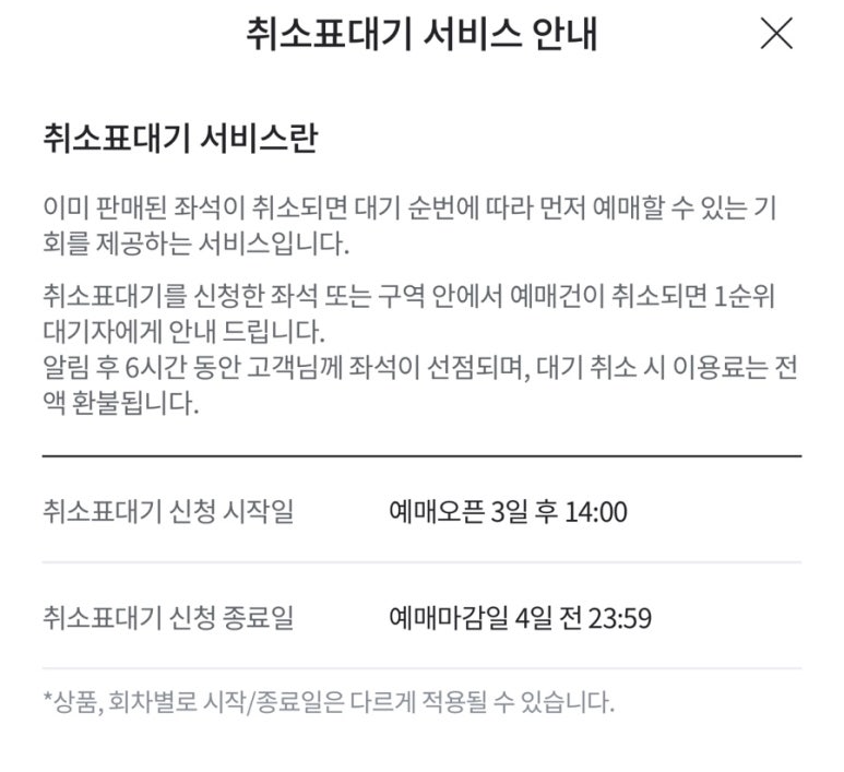 또한, 취소표 대기 신청은 시작일과 종료일이 정해져 있는데, 보통 상품의 예매오픈 3일 후 오후 2시부터 시작해, 예매마감 4일 전 오후 11시 59분까지 신청할 수 있습니다. 이 정보를 미리 확인하고, 원하는 좌석이나 구역에 대해 취소표 대기를 설정하면, 보다 효율적으로 좌석을 확보할 수 있습니다.